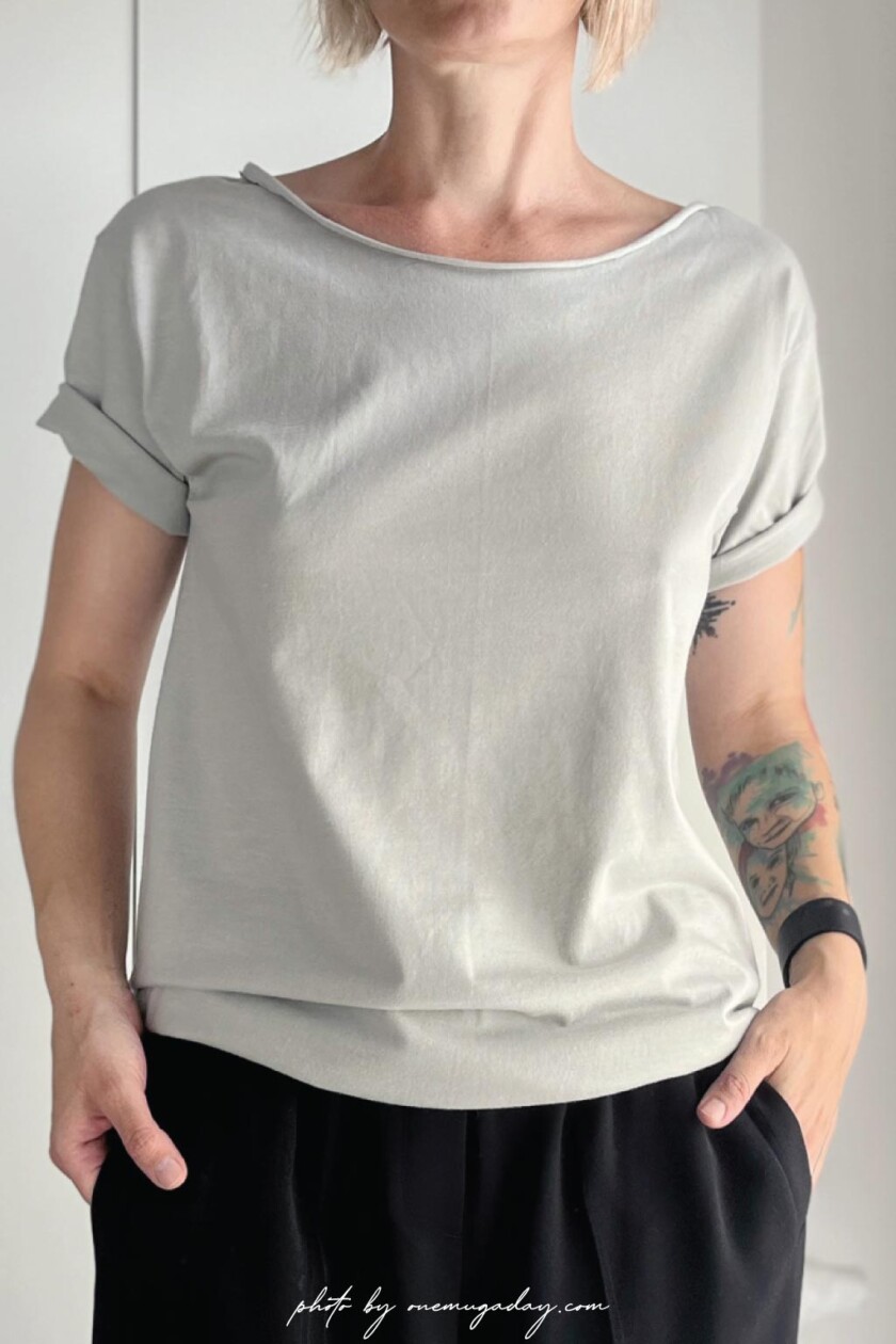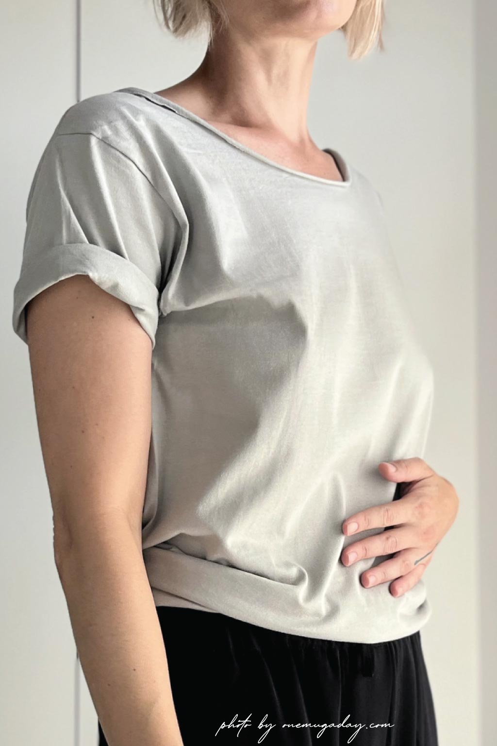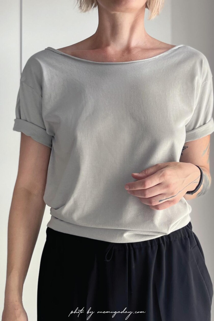 világos szürke oversize női póló, 100% pamut, bő fazon, rövid ujjú, nyers vágású nyakkivágás